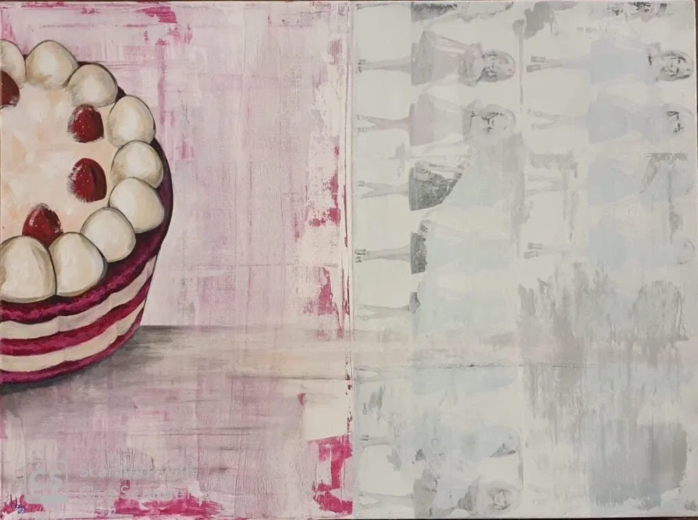 "Pepper Pair" acrylic on a recycled wood surface. "Pomegranate", "Strawberry", "Barbie Cake" and "Cabbage" acrylic on canvas, with the works "Barbie Cake" and "Cabbage" having a combination of gluing and copying techniques.